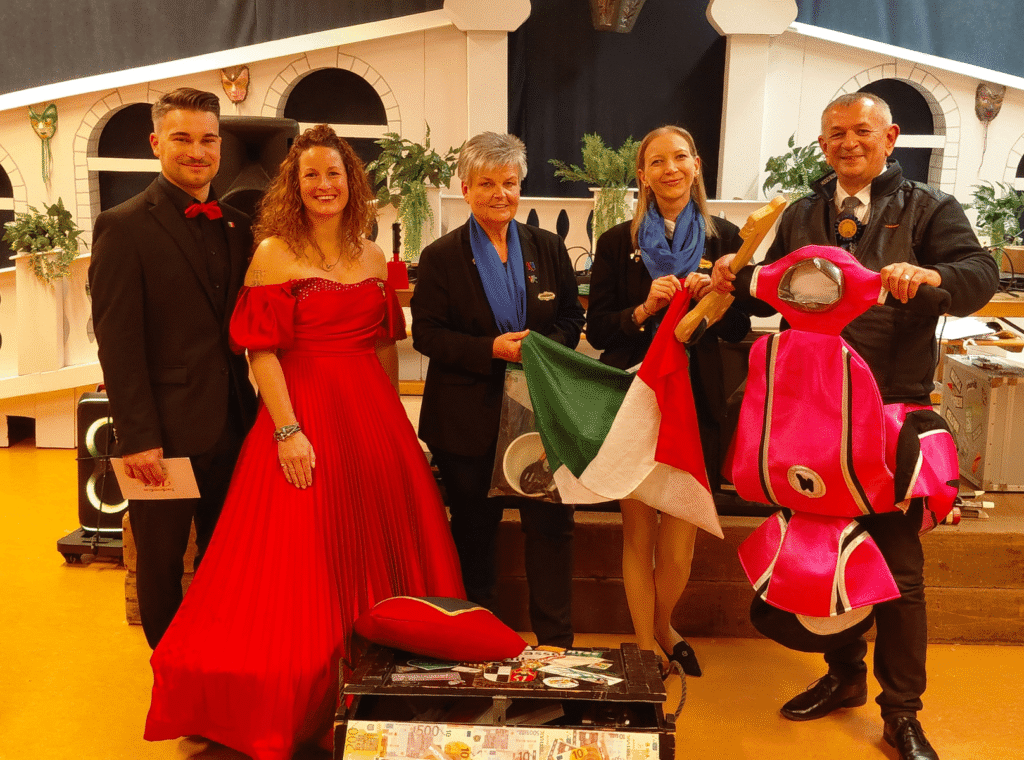 Offen blieb nur noch die Frage des 1. Bürgermeisters und Senators Frank Stumpf nach dem Schlüssel der Stadtkasse. In diesem Jahr hatten ihn wohl die „Schrubber-Damen“ auf ihrer Italienreise und beim Besuch des Ramazzotti-Museums verloren. Gott sei Dank stellte das Prinzenpaar zwei Roller zur Verfügung, mit denen sich Prinz Alex I. und 1. Bürgermeister Frank Stumpf auf die Suche begeben konnten. Schließlich wurde man nach einigen Versuchen in einem grauen Reisekoffer fündig.